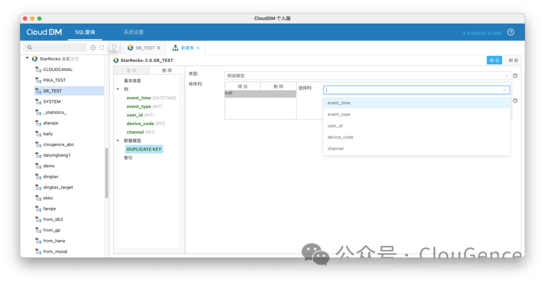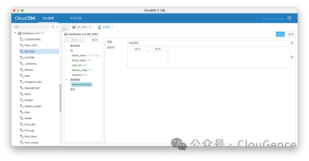 设置表的数据模型,点击数据模型,点击添加类型选择“明细模型”,接着在下方选择排序键