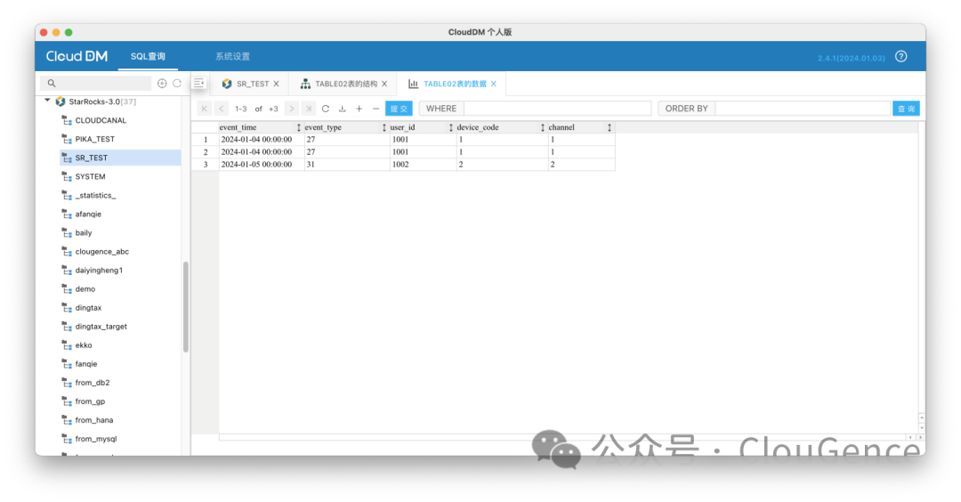 查看插入的数据,发现三条都已写入,验证明细模型的特点:写入的数据无论是否完全一致,都会插入到数据库中。如果选择的是 StarRocks 聚合模型,上面三条数据插入之后就会变为 2 条