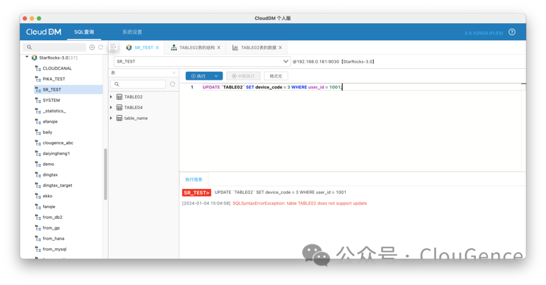 验证是否支持 Update,双击 “SR_TEST” 库打开新的查询窗口,针对这个表尝试做一次 UPDATE 操作,结果执行报错: