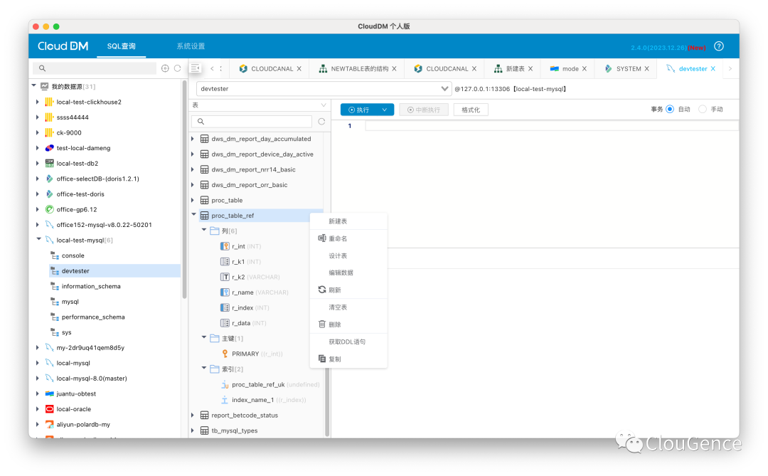 CloudDM 全新的操作体验,可以看到数据库中更详细的内容;右键菜单会根据数据库对象类型不同提示不同的操作;可以获取 表/视图的 创建语句;可以看到表的列/索引 等详细信息;