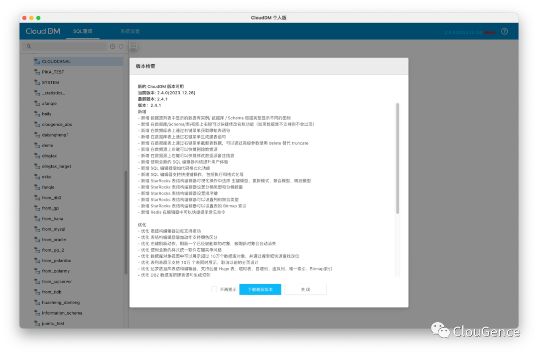 CloudDM 是 ClouGence 公司推出的一款一站式多数据源开发管理工具,使用它可以方便地访问和管理 MySQL、Oracle、PostgreSQL、阿里云 RDS、Greenplum、TiDB、Redis、StarRocks、Doris、SelectDB、SQL SERVER、ClickHouse、OceanBase 、PolarDB-X 、IBM Db2 等多种不同类型的数据库。通过 CloudDM 丰富的数据源支持可以避免在多个专业工具之间切换,从而提高工作效率