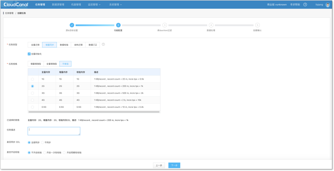 选择任务属性: 比如,是做迁移还是同步,还是做解构的一些准备。还要确定同步任务的规格以及描述等信息。