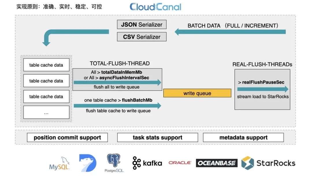 无论是全量的数据,还是通过各种日志解析、增量日志的查询,这些数据其实都会通过我们的序列化器,放到分层的 cache 系统中。对 StarRocks 而言,如何尊重其最佳写入方式,是所有数据迁移同步工具必须要做到的事情。
