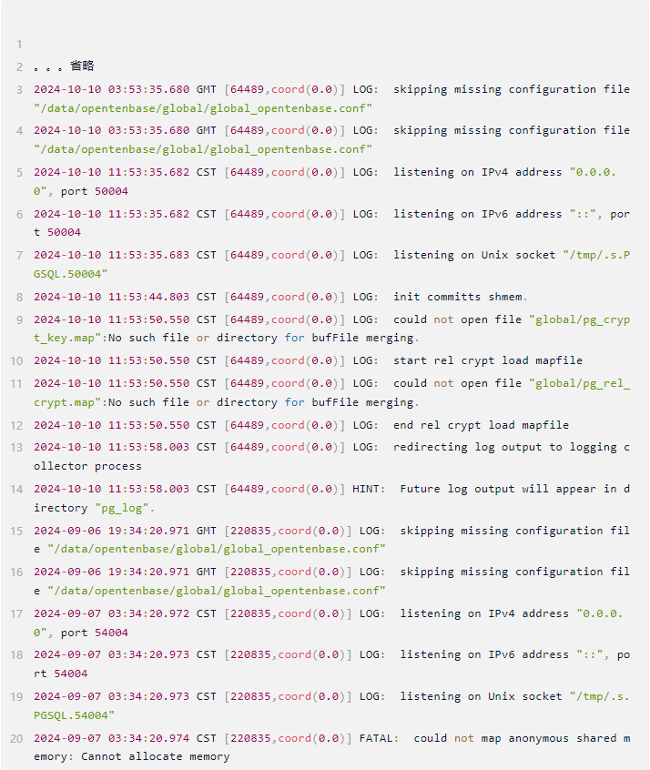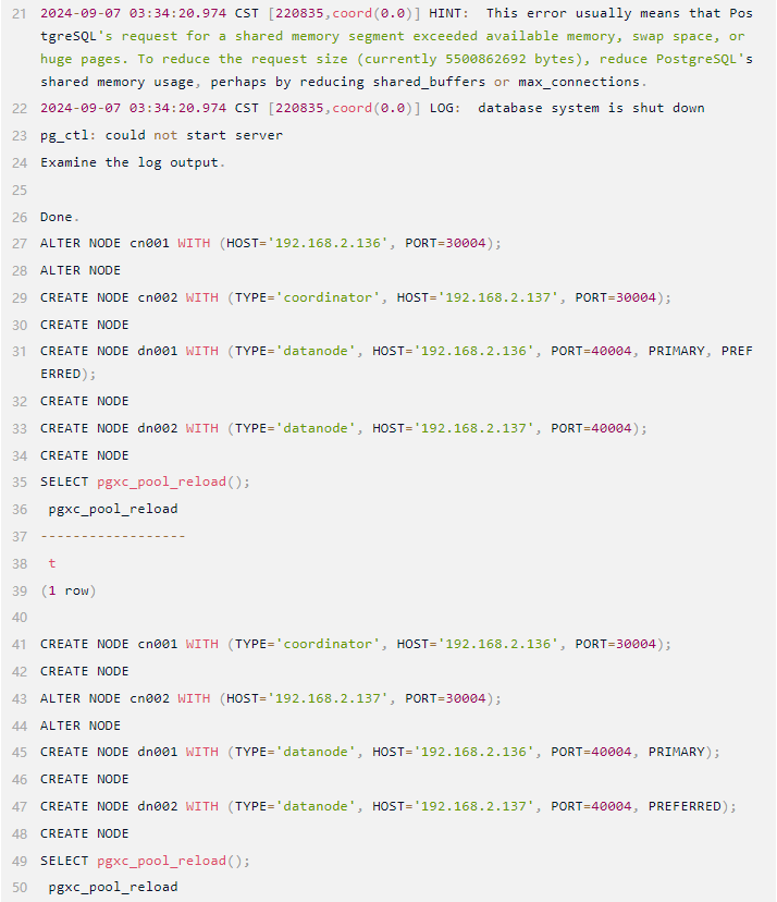 一般init集群出错,终端会打印出错误日志,通过查看错误原因,更改配置即可,或者可以通过/data/opentenbase/pgxc_ctl/pgxc_log路径下的错误日志查看错误,排查配置文件的错误