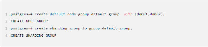 OpenTenBase使用datanode group来增加节点的管理灵活度,要求有一个default group才能使用,因此需要预先创建;一般情况下,会将节点的所有datanode节点加入到default group里 另外一方面,OpenTenBase的数据分布为了增加灵活度,加了中间逻辑层来维护数据记录到物理节点的映射,我们叫sharding,所以需要预先创建sharding,命令如下: