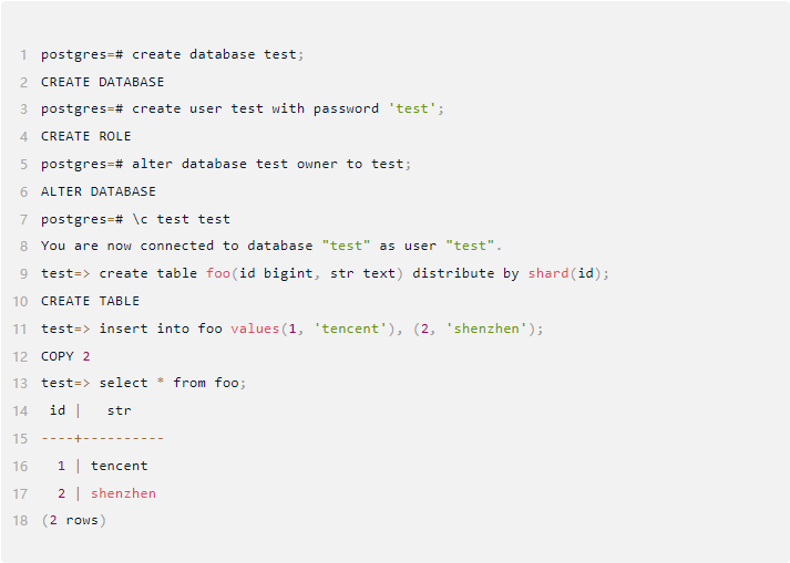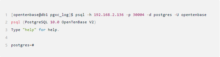 访问OpenTenBase集群和访问单机的PostgreSQL基本上无差别,我们可以通过任意一个CN访问数据库集群:例如通过连接CN节点select pgxc_node表即可查看集群的拓扑结构(当前的配置下备机不会展示在pgxc_node中),在Linux命令行下通过psql访问的具体示例如下
