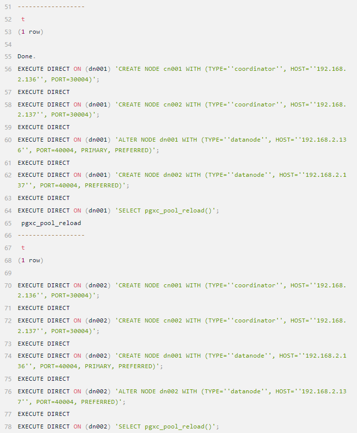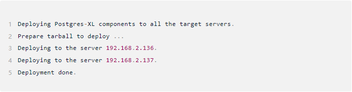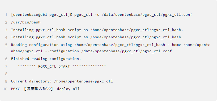 在一个节点上配置好配置文件后,使用 pgxc_ctl 工具将二进制包部署到所有节点: