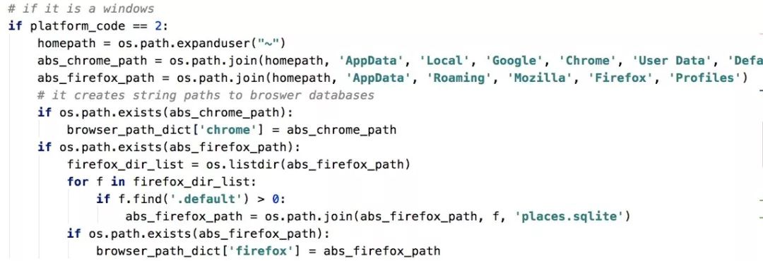 谷歌,火狐,safari 的历史浏览记录都保存在user目录下的固定位置,因此只要知道当前登录用户的user目录就以获得准确的位置。作者在get_database_paths 函数中,根据平台的不同,使用了不同的方法来确定user目录。