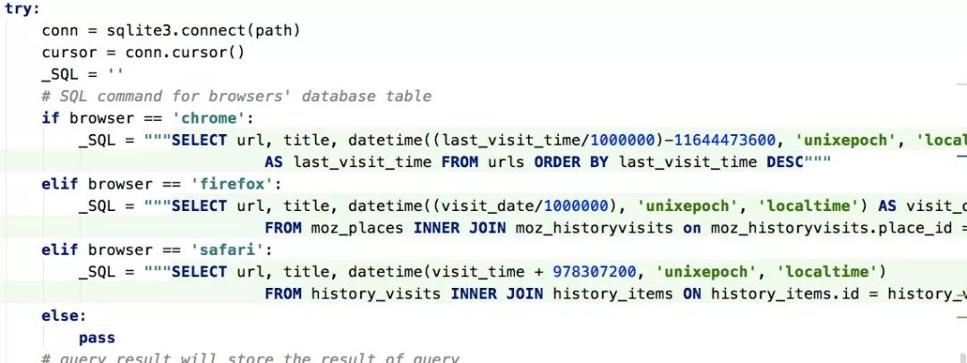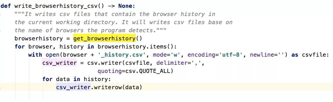 这三种浏览器的数据都存储在sqlite3中,get_browserhistory函数分别将这三种浏览器的历史浏览器记录从数据库中读取出来,这个过程需要你关闭浏览器,浏览器和你的程序无法同时操作sqlite3。
