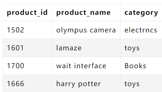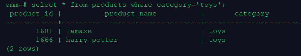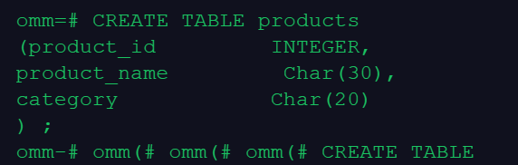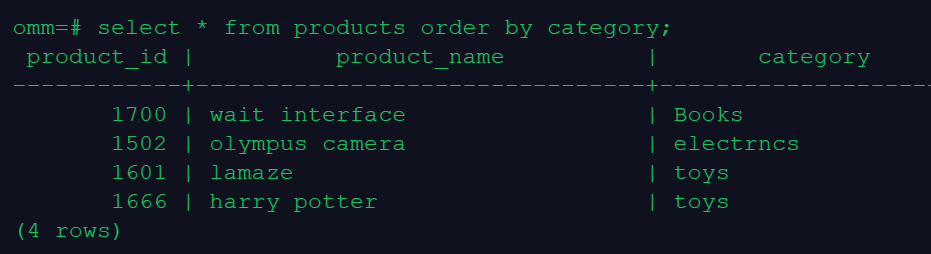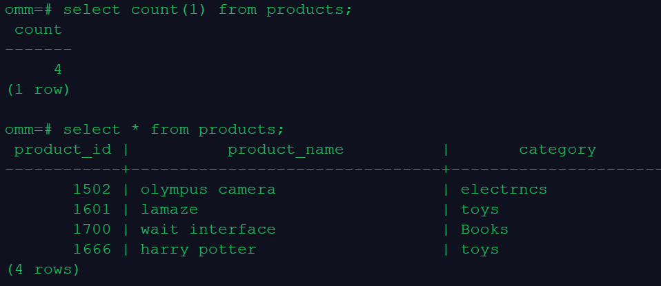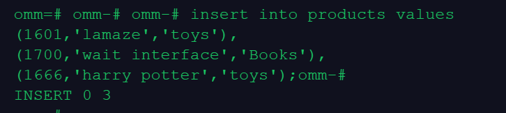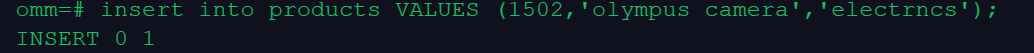 omm=# insert into products VALUES (1502,‘olympus camera’,‘electrncs’);