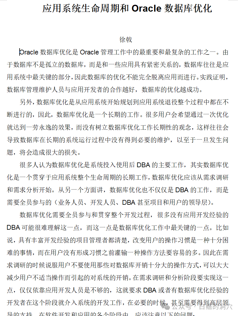 2006年左右,Oracle ACS的一个朋友找到我约一篇稿子,他希望我能写篇关于数据库优化越早越好的文章。当时约稿的目的是因为很多大客户的数据库应用搞得太不讲究,性能存在较大的问题,ACS的工程师在给客户做巡检的时候,需要花大量的时间帮用户解决一些十分低级的性能问题,他们认为这些问题原本是可以在系统开发时解决掉的。他们希望让用户在开发应用时多考虑考虑性能优化的问题,让Oracle能够用得更好,从而能够降低Oracle售后服务的压力。于是我写了一篇题为《应用系统生命周期和Oracle数据库优化》的文章,发表在《Oracle技术通讯》上了。