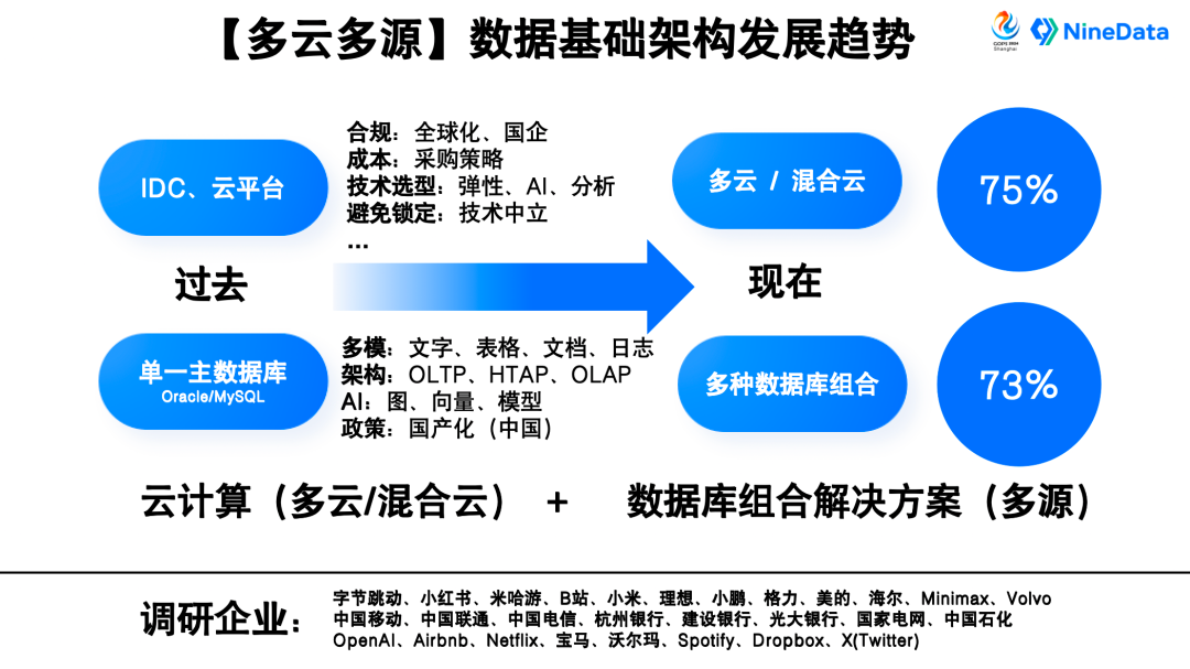过去与现在对比:过去以单一主数据库(如 Oracle/MySQL)为主,现在朝着云计算(多云 混合云)与多种数据库组合解决方案(多源)发展。这是由于企业数据需求变得更加复杂,包括多模数据(文字、表格、文档、日志等)、多种架构类型(OLTP、HTAP、OLAP)以及不同的 AI 应用场景(图、向量、模型等)。同时,政策合规(如国产化)、成本、技术选型(弹性、AI、分析等)以及避免技术锁定等因素也促使了这种架构的转变。 调研企业:我们可以看到,许多企业都已经在采用这种多云多源架构。无论是互联网行业的字节跳动、小红书、米哈游、B 站、小米、理想、小鹏等,还是制造业的格力、美的、海尔等,甚至国际知名企业如 OpenAI、Airbnb、Netflix、宝马、沃尔玛、Spotify、Dropbox、X (Twitter) 等,都在积极探索和应用这种架构,以适应不断变化的市场环境和业务需求。