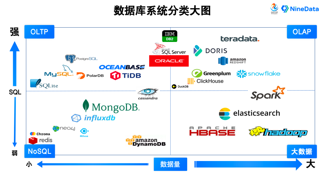 数据库系统分类:介绍了丰富的数据库系统分类,包括关系型数据库(如 Oracle、MySQL、PostgreSQL 等)、分布式关系型数据库(如 TiDB)、数据仓库(如 Snowflake)、NoSQL 数据库(如 Redis、MongoDB 等)。国产数据库也呈现出百花齐放的态势,如达梦、人大金仓、OceanBase 等。
