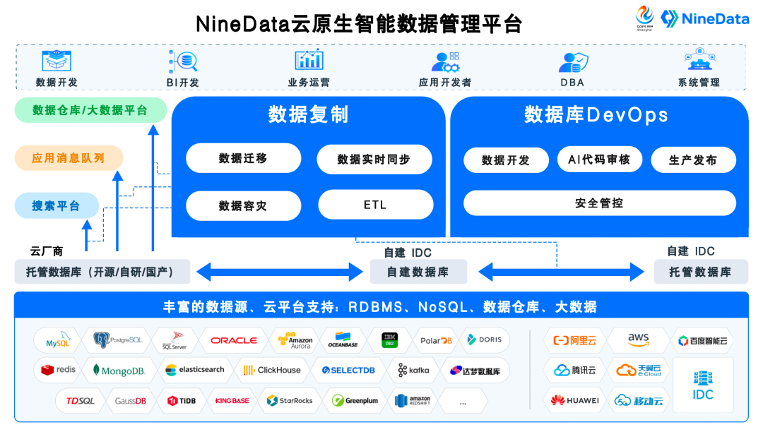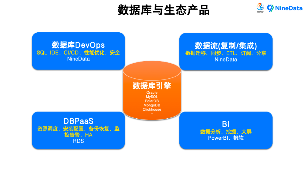 数据库与生态产品:数据库与生态产品紧密相关,涵盖数据库引擎、DevOps 工具、数据流(复制 / 集成)、DBPaaS、BI 等方面。NineData 致力于安全高效地管理无处不在的数据,支持跨云 / IDC 私网连接,提供丰富的数据源和云平台支持。