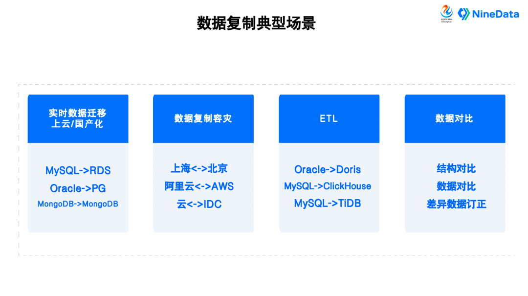 容灾场景:包括上海与北京之间、阿里云与 AWS 之间以及云与 IDC 之间的数据复制容灾。