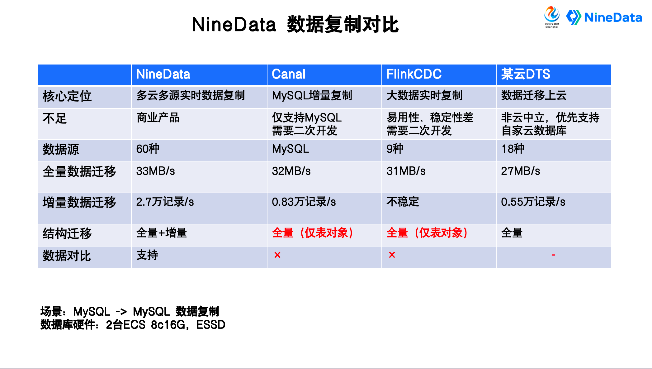与 Canal、FlinkCDC、某云 DTS 等相比,NineData 核心定位为多云多源实时数据复制。在数据源数量上具有优势(60 种对比其他产品的 9 - 18 种),在全量和增量数据迁移、结构迁移、数据对比等方面表现更优。其他产品存在仅支持特定数据库或需要二次开发、易用性和稳定性差、非云中立等不足。