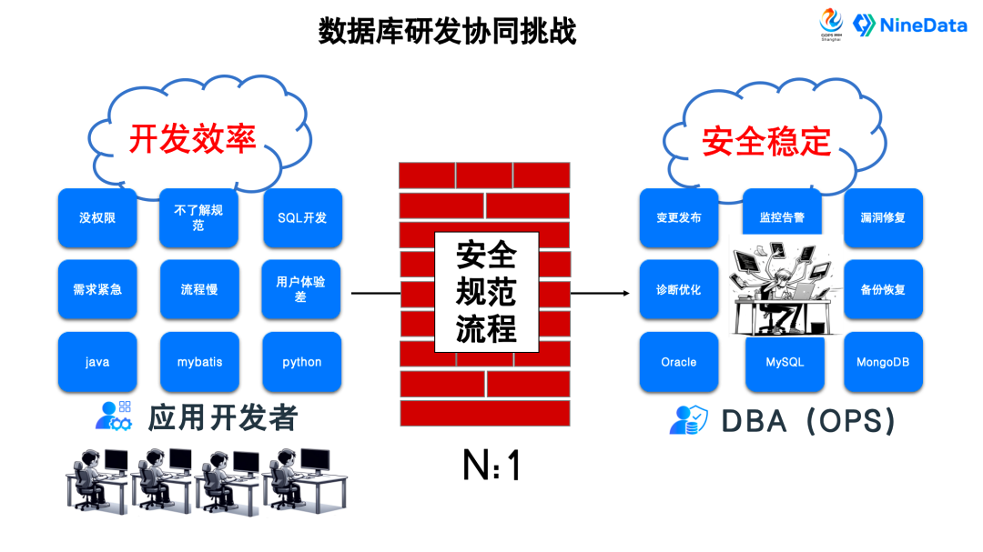 挑战:数据库研发协同面临安全稳定、开发效率等挑战,涉及应用开发者和 DBA(OPS)之间的协作问题,如变更发布、监控告警、诊断优化、慢 SQL 治理等方面存在困难。