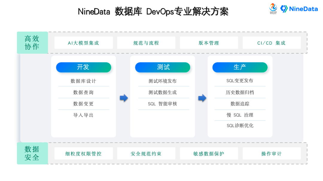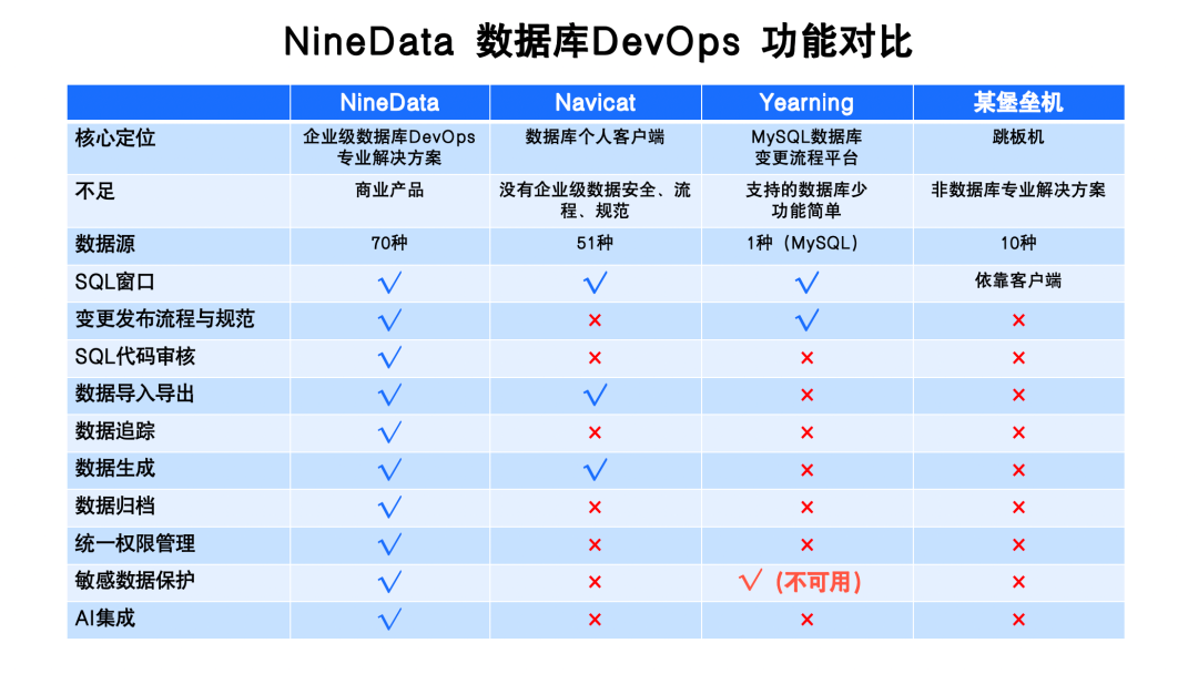 解决方案:NineData 提供了专业解决方案,具有多云、多数据库支持(60 种),云中立且支持主流云平台,支持本地一键安装部署,具备更灵活的 DevOps 业务模型以及 AI 大模型创新等特点。