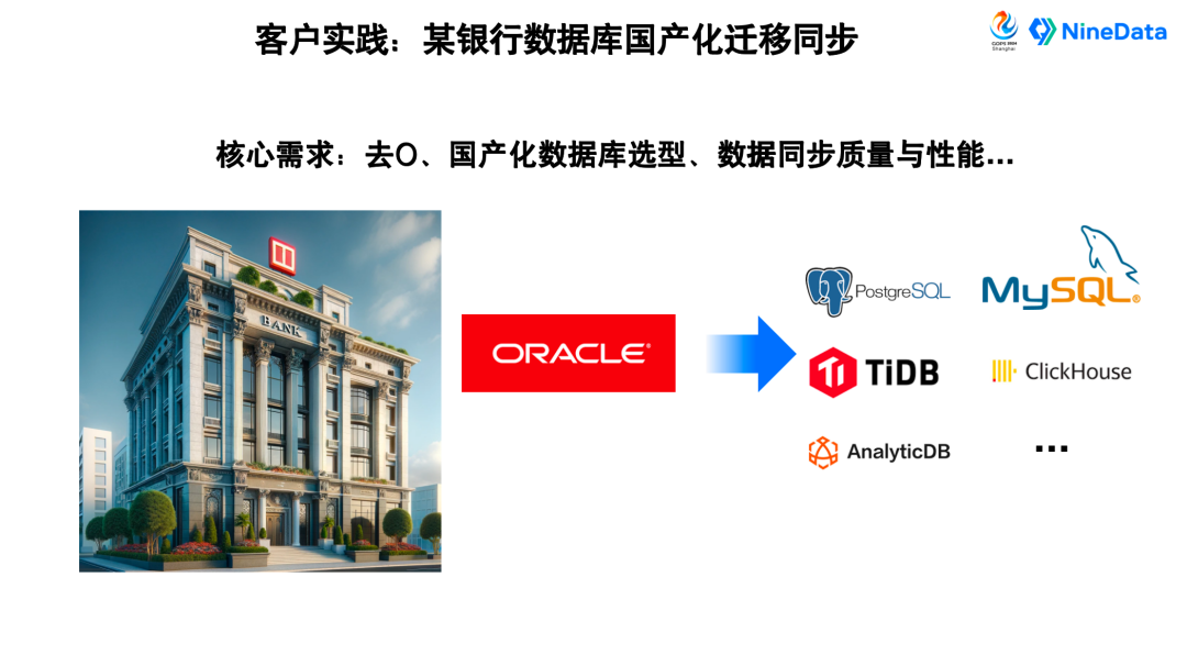 这里介绍 NineData 在银行数据库国产化迁移的实践,这个例子是将 Oracle 同步到各种新的数据库,包括开源和国产的数据库,并且还涉及国产数据库的同步和迁移到新的数据库平台。