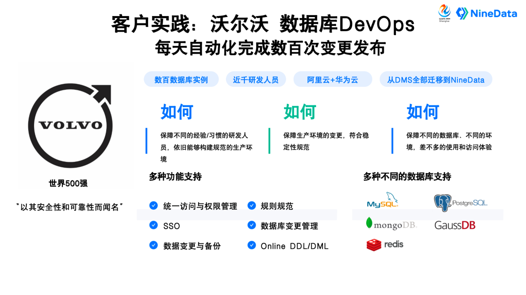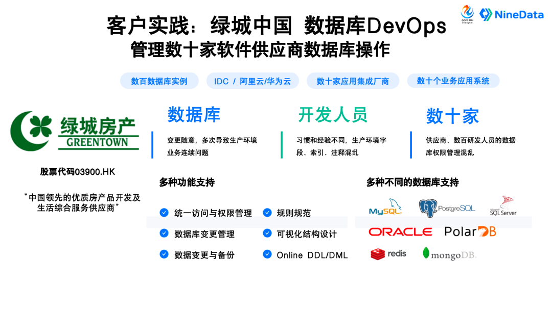 采用统一访问与权限管理、数据库变更管理、规则规范、可视化结构设计、数据变更与备份、Online DDL/DML 等措施,支持多种不同数据库,管理数十家软件供应商数据库操作。