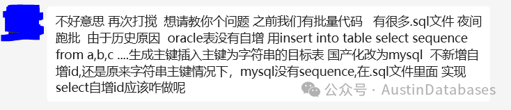 开头还是介绍一下群,如果感兴趣PolarDB ,MongoDB ,MySQL ,PostgreSQL ,Redis, OceanBase, Sql Server等有问题,有需求都可以加群群内有各大数据库行业大咖,可以解决你的问题。加群请联系 liuaustin3 ,(共2500人左右 1 + 2 + 3 + 4 +5 + 6 + 7 + 8)(1 2 3 4 5 群均已爆满,6群停止进人,新人进7 群 8 群)