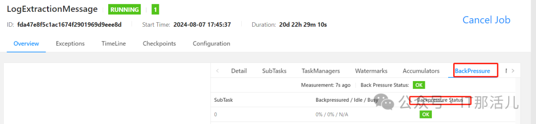 通过颜色和数值来展示繁忙和压力的程度; 通过UI进入jobs查看SubTask的Records Sent 和 Record Received 项确认是否存在数据倾斜,存在倾斜也会导致背压过高问题; 再通过BackPressure确认是否背压过高,过高状态为“HIGH”,该方式可快速确定是否存在背压高的情况。