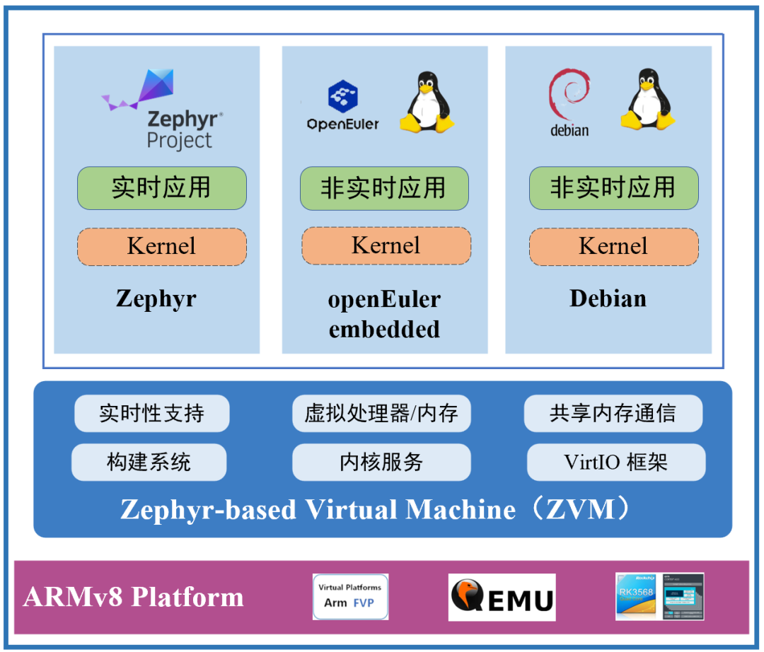 ZVM项目(仓库地址:https://gitee.com/openeuler/zvm)是在开源实时操作系统 Zephyr RTOS(由Linux基金会托管)上构建的一款虚拟机管理器(Hypervisor),ZVM一方面继承了Zephyr RTOS的开源生态和特性,另一方面为业界提供了一个原创的面向嵌入式场景的开源虚拟化平台解决方案。
