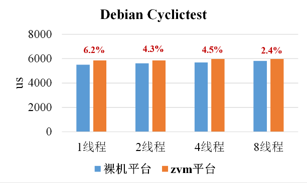测试结果如上图所示,横坐标为CPU密集型线程数量,纵坐标为具体的延迟数据指标(单位为us)。我们选择1,2,4,8等四个CPU密集型任务数量作为采样点。结果显示,相比于裸机,Debian运行在ZVM上时,最大延迟增加了6.2%,最小延迟增加了2.4%。随着系统负载的增加,Debian在ZVM运行的Cyclictest测试结果逐渐逼近裸机。具体原因是负载较轻情况下ZVM本身内核的线程存在资源竞争会会对Debian线程有一定影响,而当负载到达一定临界值时,裸机与ZVM的资源竞争都满量。