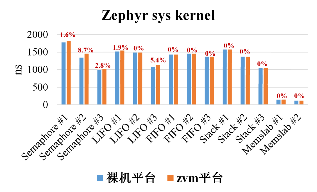 我们分别在裸板和ZVM上运行Zephyr RTOS,并在Zephyr RTOS中运行Zephyr sys kernel基准测试集,其主要评估Sem、LIFO、FIFO、堆栈和Memslab等内核对象的操作效率,以体现系统开销。见Zephyr sys kernel:https://github.com/ zephyrproject-rtos/zephyr/tree/main/tests/ benchmarks/sys_kernel 详细描述。