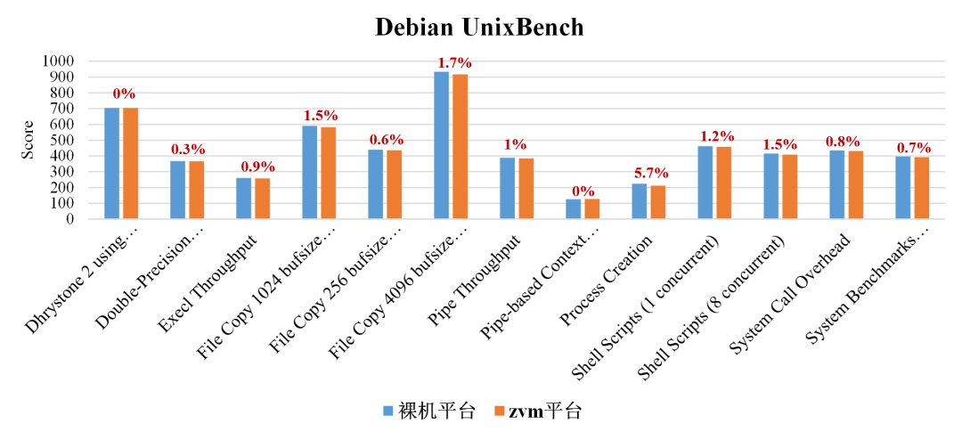 测试结果如上图所示,横坐标为各项基准测试项,纵坐标各个基准项的评分(Score数值)。测试结果显示,相比于裸机平台,ZVM上运行Debian的Process Creation测试项所引入的性能损耗最大(5.7%),其余项的性能损耗都在2%以内。ZVM和裸机对比,基准指数分数上的开销损耗仅为0.7%。说明ZVM上运行Debian的性能达到了裸机平台的99.3%,基本可以忽略不计。