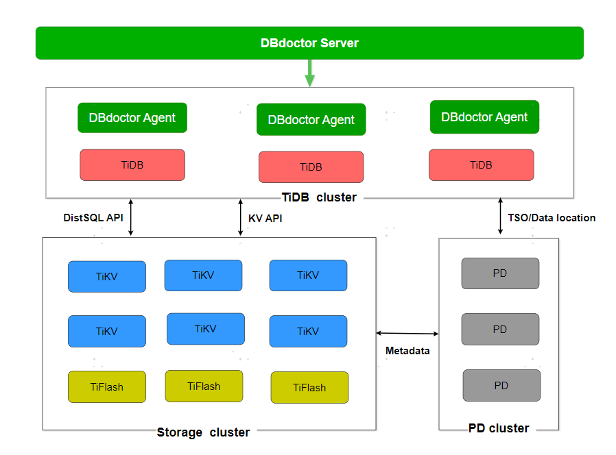 图中TiDB分布式数据库包含TiDB Server、TiKV以及PD Server三种类型节点。