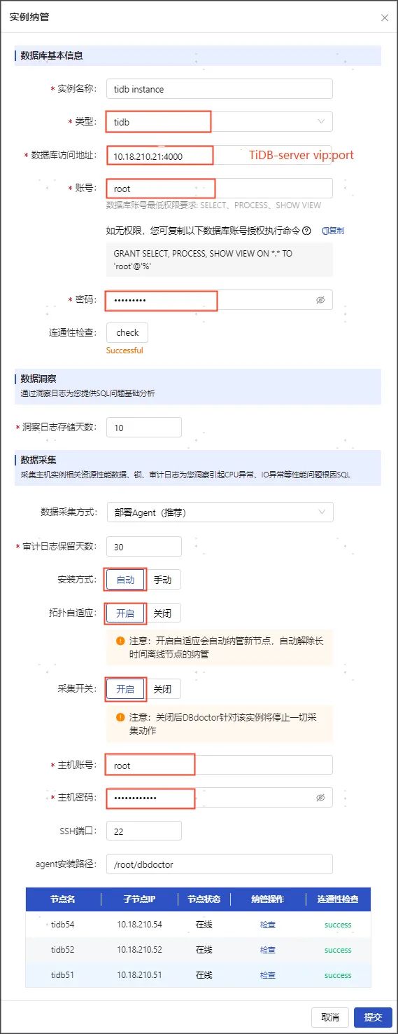 录入TiDB node所在主机的账号信息,默认自动安装Agent。注意:开启拓扑自适应后,DBdoctor Server可动态纳管扩展的TiDB Server节点,并下线缩减的TiDB Server节点;