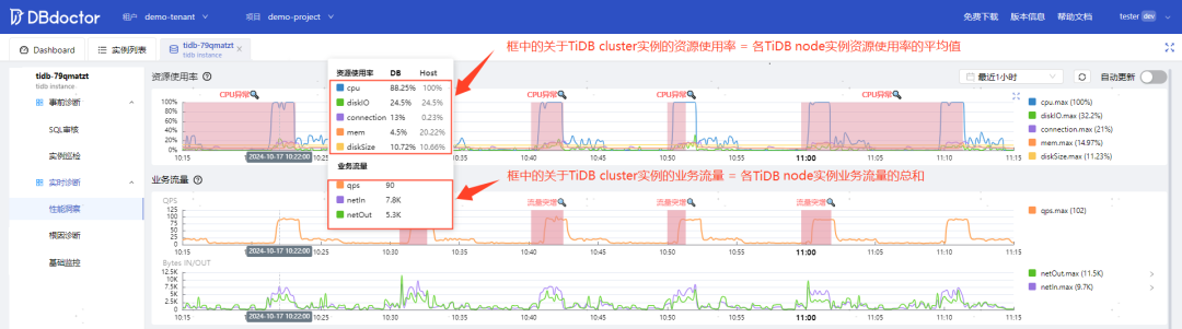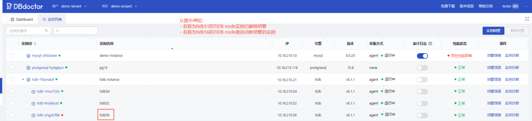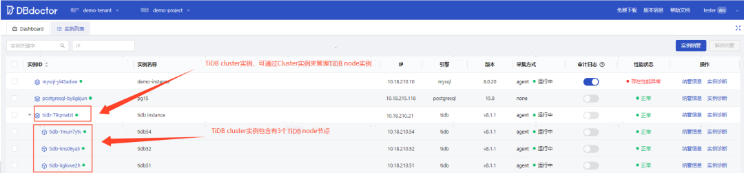 连通性检测通过后,点击提交后即可成功纳管TiDB数据库。在实例列表界面,可以看到已纳管的TiDB cluster实例及TiDB node实例信息。此时,性能洞察已开启,开始体验DBdoctor的强大吧!