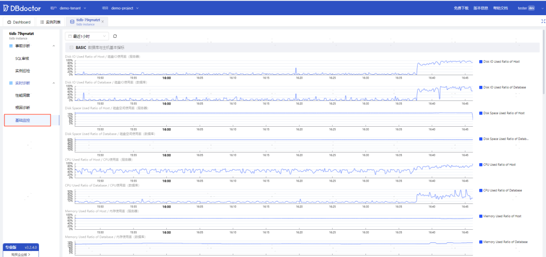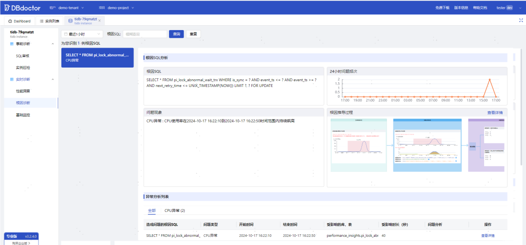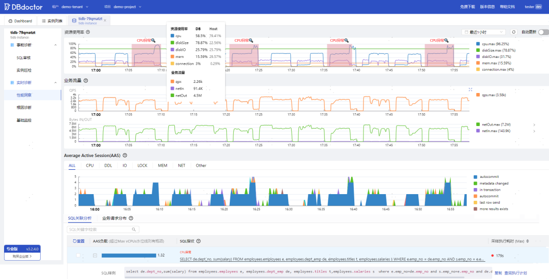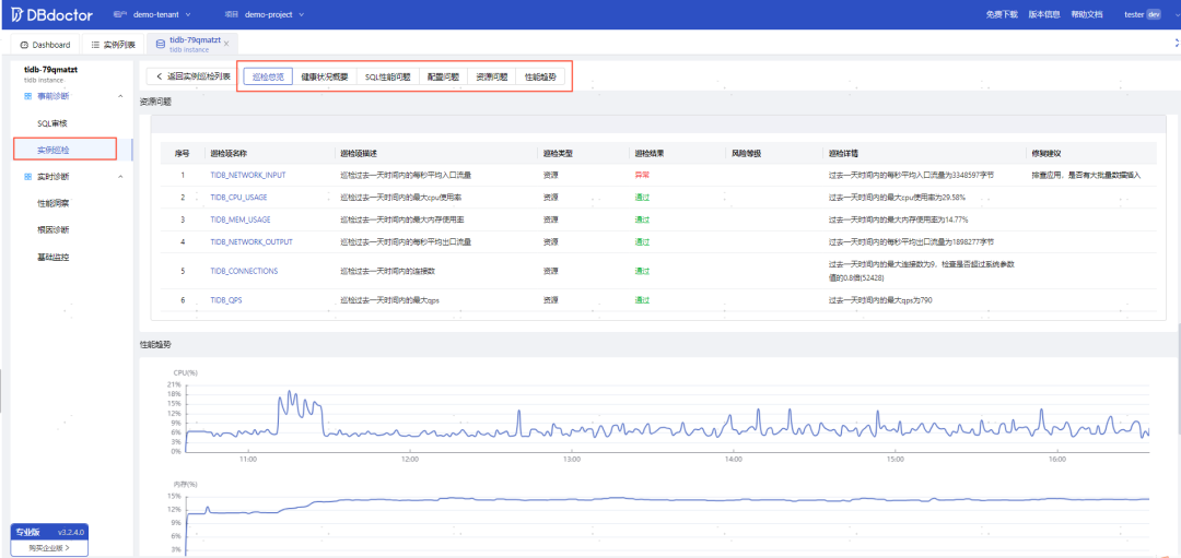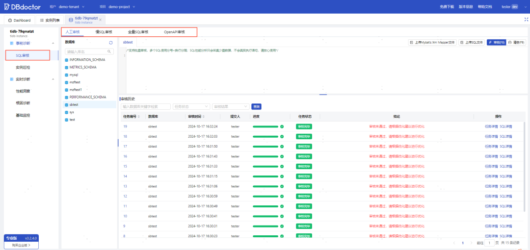 当前DBdoctor 适配TiDB-6.0及以上版本,并提供SQL审核、实例巡检、性能洞察、根因诊断、基础监控等功能服务。