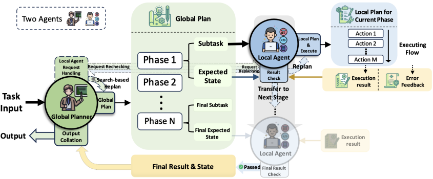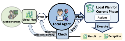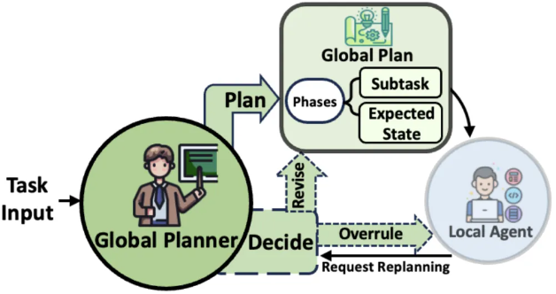 它负责制定详尽的计划,并将这些计划分解成一系列具有明确目标的阶段性子任务。该智能体负责监督整个计划的执行,确保每个阶段的目标都清晰无误。当局部执行智能体提供反馈时,全局规划智能体会进行评估,并在必要时提出调整建议,以指导和优化执行过程。它维护计划的连贯性,并在需要时进行整合或修改,以确保最终结果与最初的策略保持一致。
