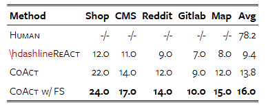 在我们的研究中,我们以WebArena论文中使用的ReAct模型作为比较基准。对于我们的方法,我们提出了CoAct w/ FS这一改良版本,其中"FS"代表强制停止机制,意味着当对话轮次达到预设的上限时,系统将自动结束对话。下表展示了ReAct与我们提出的CoAct框架在WebArena基准测试中的对比数据。结果显示,CoAct相较于ReAct在性能上提升了超过40%,在需要强制中断干预的情况下,提升幅度更是达到了70%。此外,CoAct在所有五个测试任务中均优于ReAct,这证明了CoAct在处理实际任务时的高效性和适应性。