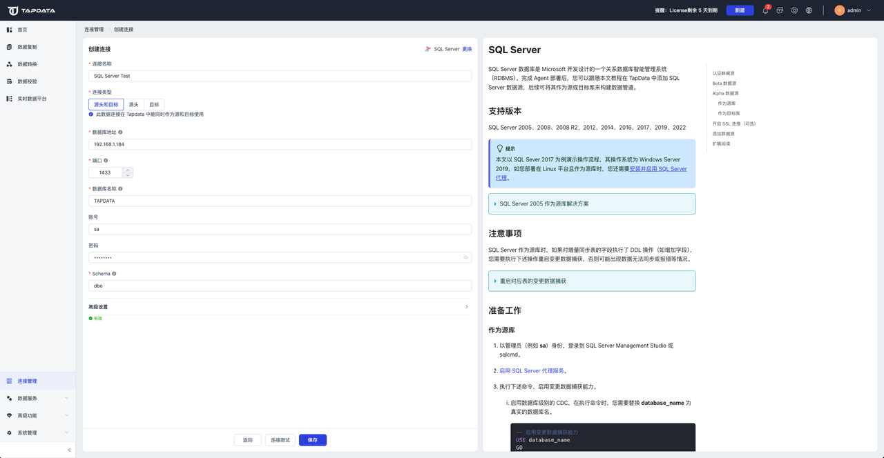 完成 TapData Agent 部署后,即可跟随以下教程在 TapData 中添加源与目标的数据连接(支持版本:SQL Server 2005、2008、2008 R2、2012、2014、2016、2017、2019、2022;DM 7.x、8.x),并快速构建数据管道。(*涉及工具版本为 TapData 本地部署版)