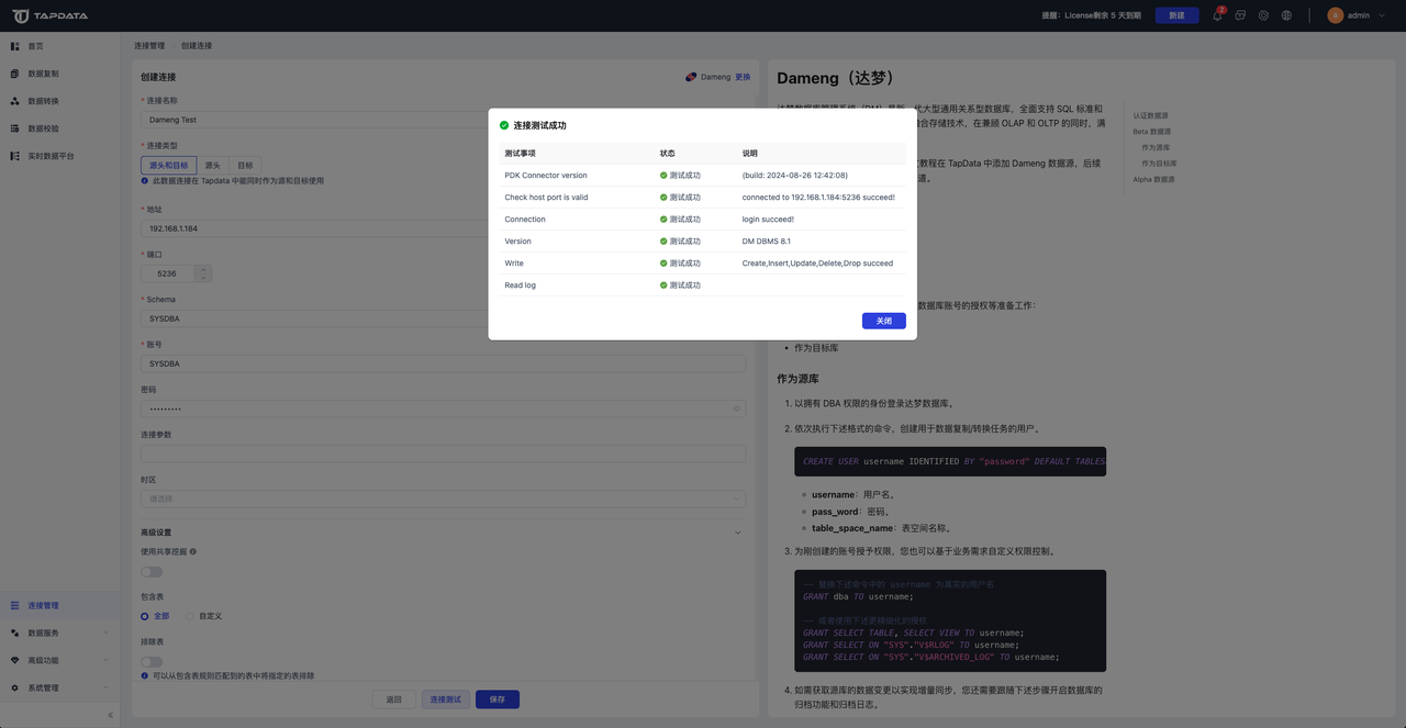 在连接 DM 之前,还需完成数据库账号的授权等准备工作。TapData 同时支持 DM 作为源或目标,当 DM 作为目标库时,准备工作包括: