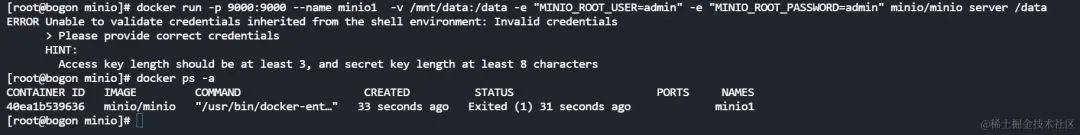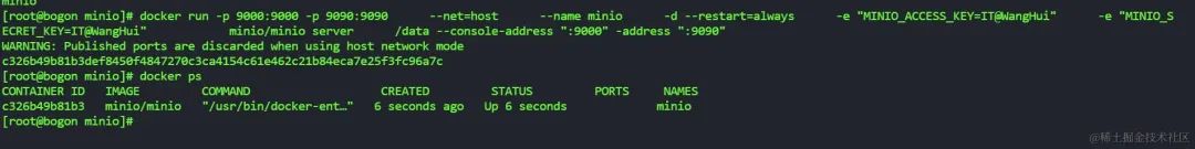 docker run -p 9000:9000 -p 9090:9090 --net=host --name minio -d --restart=always -e "MINIO_ACCESS_KEY=IT@WangHui" -e "MINIO_SECRET_KEY=IT@WangHui" minio/minio server /data --console-address ":9000" -address ":9090"