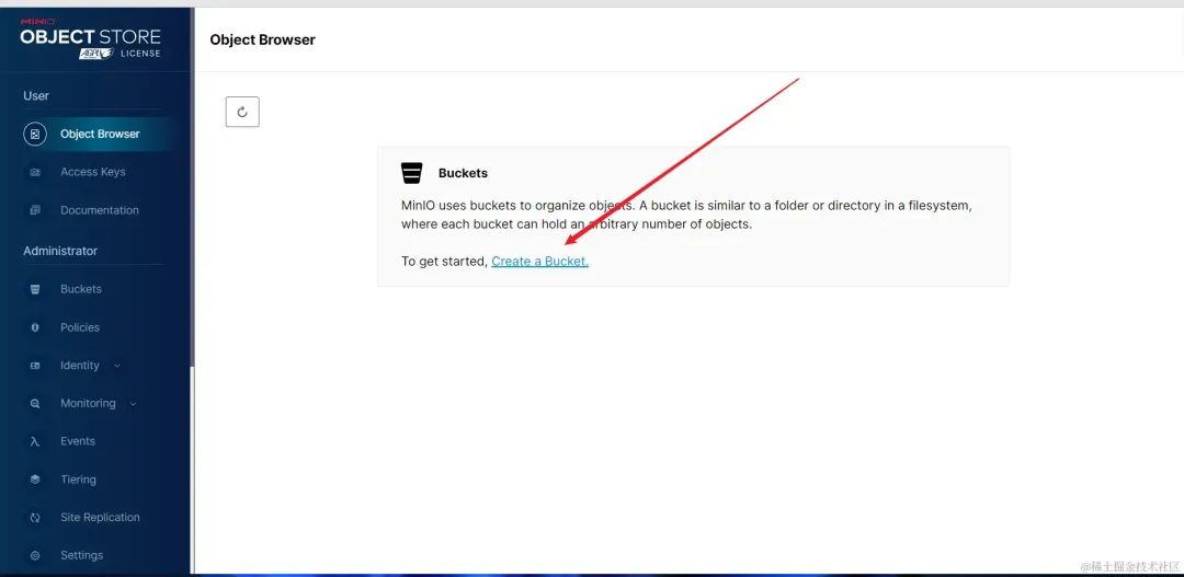 当启动后在浏览器访问http://localhost:9000就可以访问minio的图形化界面了,如图所示: