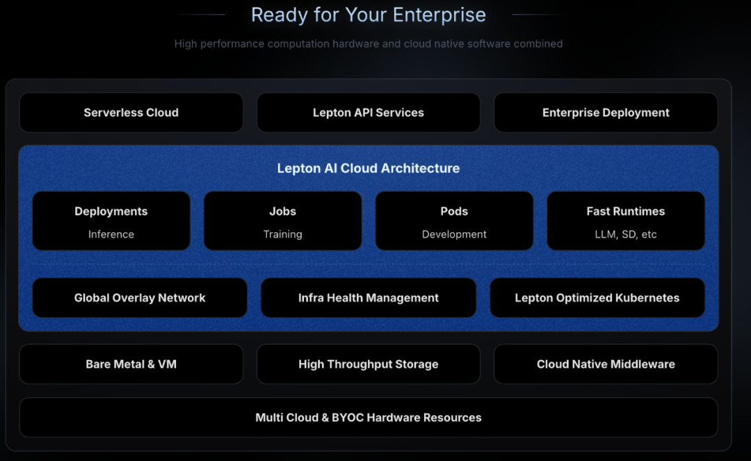 有兴趣的可以去官网看看(https://www.lepton.ai/),下图是官网扒过来的架构图。
