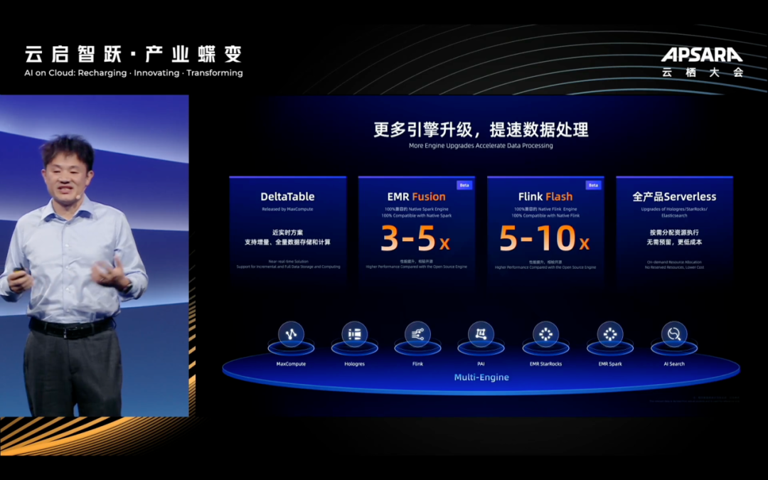 各个计算引擎的升级,EMR,Flink 性能增强,maxcomputer 支持deltatable,近实时方案。全产品的支持 Serverless。