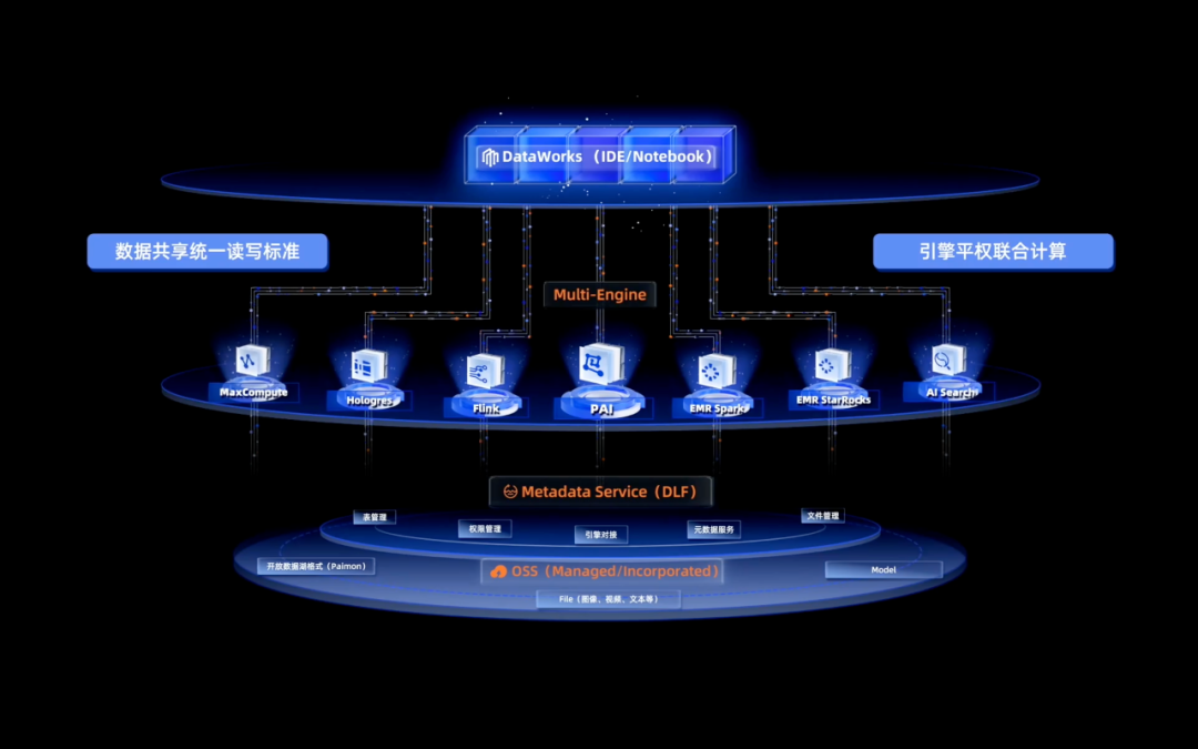 Openlake 展示,上面是 datawokrs 负责开发,中间是各类计算,AI 引擎,DLF 负责元数据关联,数据承载在对象存储上(数据湖上)