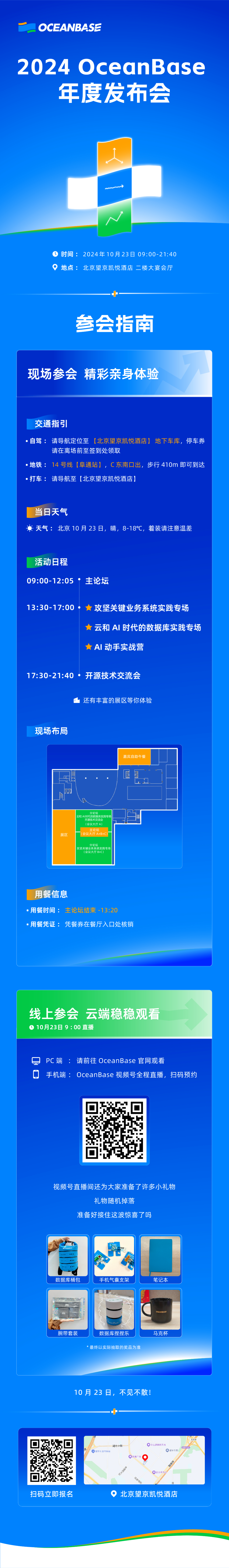 本次发布会采用线下会议+线上直播两种形式,您可以自由选择参会方式,感受“不止于记录”的 OceanBase。