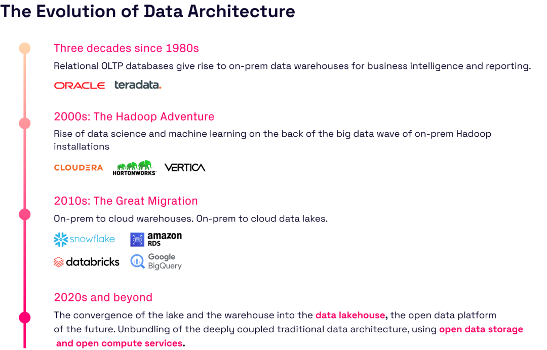 为了帮助回答这些问题,我们将探索数据架构多年来的演变,将湖仓一体架构分解为各个组成部分,并执行一些比较分析,以区分哪些是开放的,哪些不是。让我们从一点历史开始。