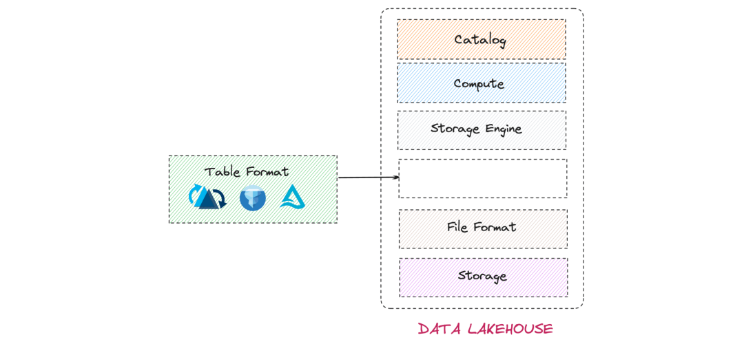 • 存储/表格格式: 表格式或存储格式充当文件格式层上的开放元数据层。它提供了一个抽象,将文件的逻辑表示与物理数据结构分开。表格式在不可变数据文件上定义架构,启用事务功能,并为读取器和写入器提供 API 以与数据交互。