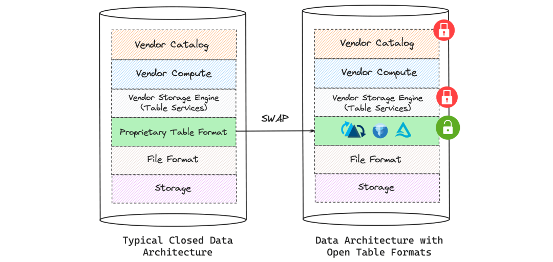 这些功能对于在 Lakehouse 架构中运行分析工作负载至关重要。然而,现代表格式的关键要点是它们的开放性。这种开放性确保与特定表格式兼容的任何引擎都可以访问数据,从而将它们与供应商特定数据库和数据仓库中使用的专有(封闭)表格式区分开来。