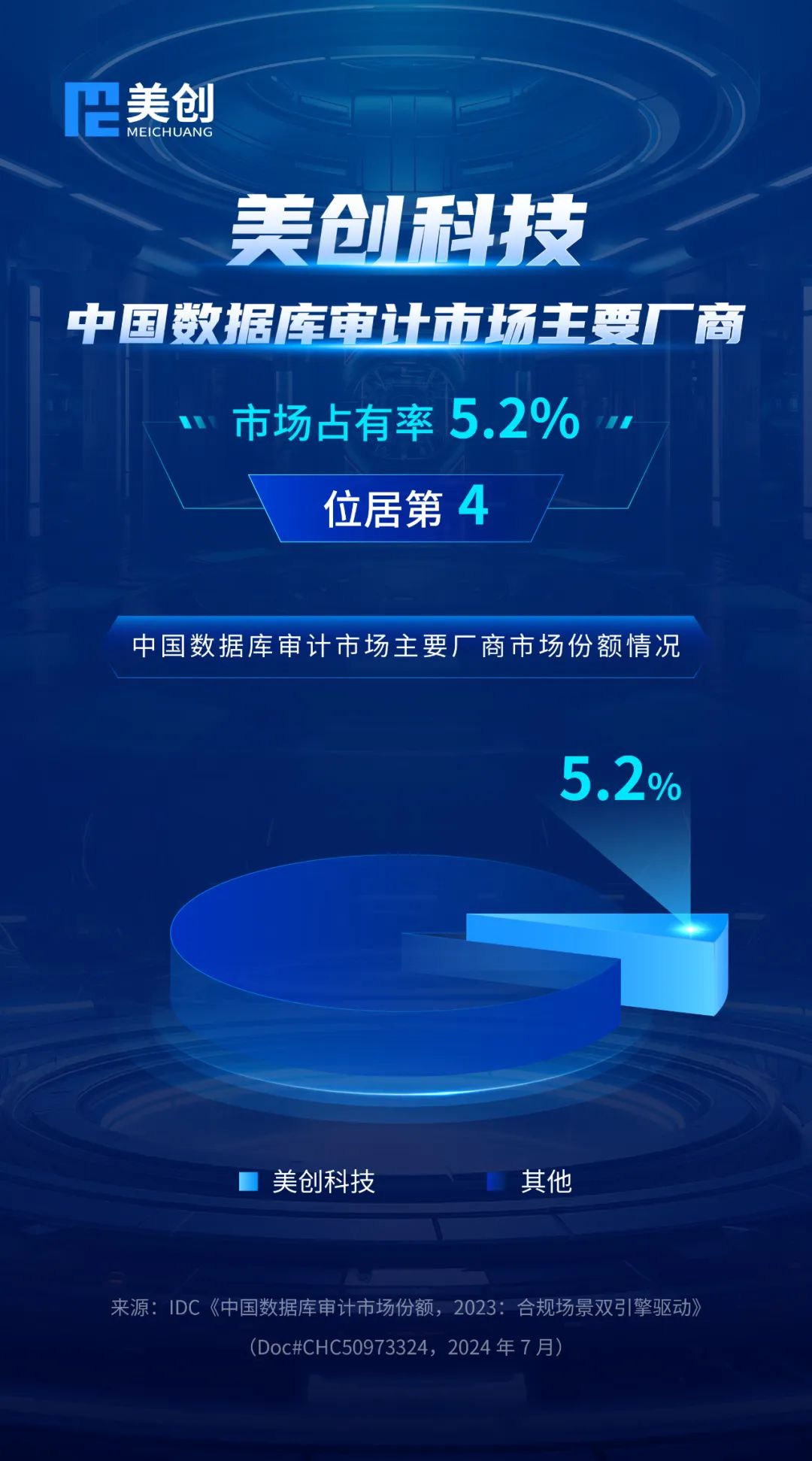 IDC正式发布针对中国数据库审计市场份额研究报告——《中国数据库审计市场份额,2023:合规场景双引擎驱动》(Doc#CHC50973324 ,2024年7月)(以下简称“IDC报告”),报告对2023年中国数据库审计市场的规模、增长速度、主要玩家、市场与技术的发展趋势等内容进行了详细研究,美创科技以5.2%市场份额位列中国数据库审计主要厂商第四名!