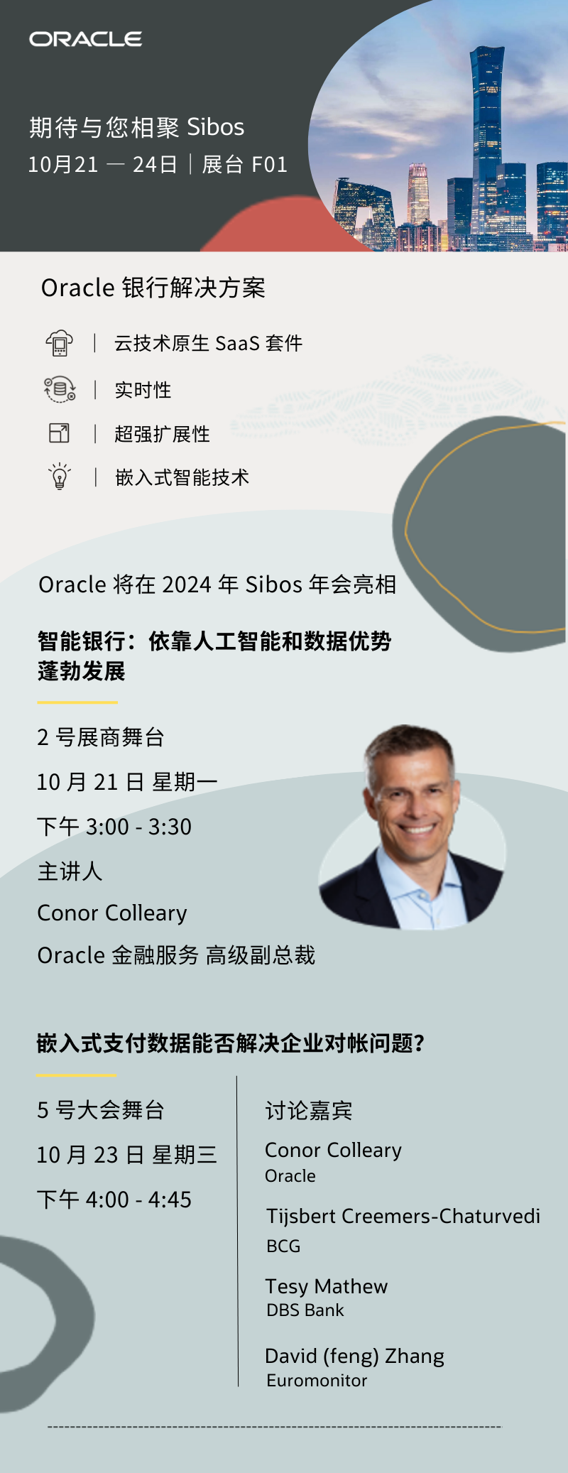 Oracle 金融服务作为面向零售银行和企业银行提供金融服务和支付解决方案的优秀供应商,将亮相今年的 Sibos 2024 年会。凭借我们全面的 SaaS 原生超可扩展性银行平台,银行能够实时提供新一代金融服务和支付。