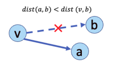 HNSW中的RNG裁边规则对HNSW的高效图结构起到了重要作用,可以在保证连通度的同时,让图变得更加稀疏以提高查询效率。然而,在混合查询中,RNG裁边规则有可能破坏图的连通性。如下图,在RNG规则中,v到b的边可以被裁剪,因为一般认为a到b会有边,所以v到b可以通过a作桥梁。但是在混合查询中,如果a没有满足标量标签,v就无法到达b。